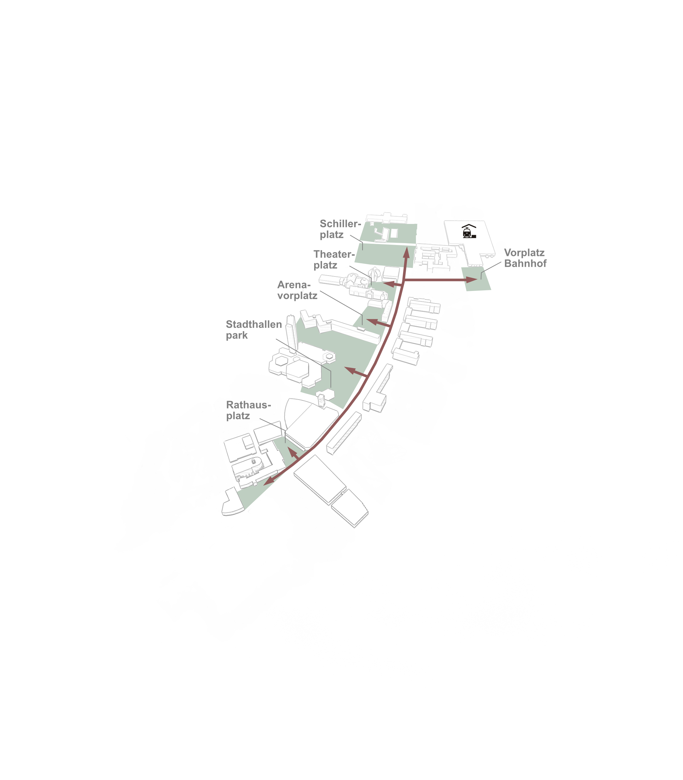 Das Zentrum von Chemnitz wird im Rahmen eines umfassenden städtebaulichen Entwurfs neu gedacht. Während sich das Stadtzentrum bislang weitgehend auf die historische Altstadt beschränkte, weitet das neue Konzept die Perspektive aus und bindet bisher randständige Orte wie den Hauptbahnhof, den Theaterplatz, die Stadthalle und den Platz der neuen Arena in ein erweitertes, zusammenhängendes Zentrum ein. Im Mittelpunkt steht dabei die Entwicklung eines urbanen Stadtraums, der nicht nur funktional, sondern auch gestalterisch, ökologisch und sozial erweiterten Ansprüchen gerecht wird.