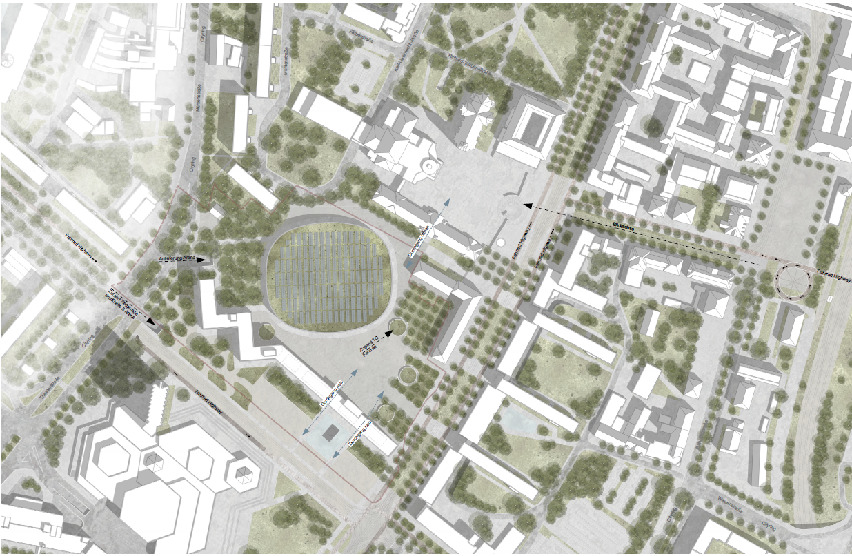 Auch der Karl-Marx-Kopf als prägendes Wahrzeichen wird neu inszeniert: Durch den Rückbau des Erdgeschosses der angrenzenden Parteifalte in Teilbereichen entstehen zwei neue Wegeverbindungen, die den Stadthallenpark mit dem Vorplatz der Arena verbinden. Pavillons mit Arena-Nutzungen aktivieren die entstehenden Freiflächen und fördern eine lebendige Nutzung des Umfelds. Die Schrifttafel sowie der Zickzack bleiben als denkmalgeschützte Elemente erhalten. Eine umlaufende Wasserfläche spiegelt das Denkmal und erhöht seine Präsenz im Stadtraum. Bestehende Baumreihen werden durch neu gepflanzte ergänzt und fassen die Freifläche zu einem harmonischen Gesamtbild.