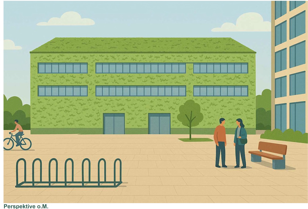 Die Begrünung ist integraler Bestandteil des Klimakonzepts. Das intensiv begrünte Dach speichert Wasser und reduziert Hitzeeinträge. Vertikale Rankpflanzen an allen vier Seiten der Fassade fördern die Biodiversität, verbessern das Mikroklima und tragen zur städtebaulichen Integration bei. Das anfallende Regenwasser wird gesammelt, vorgefiltert und zur WC-Spülung sowie zur Bewässerung genutzt. Eine PV-Anlage ist bei Bedarf ergänzbar.
