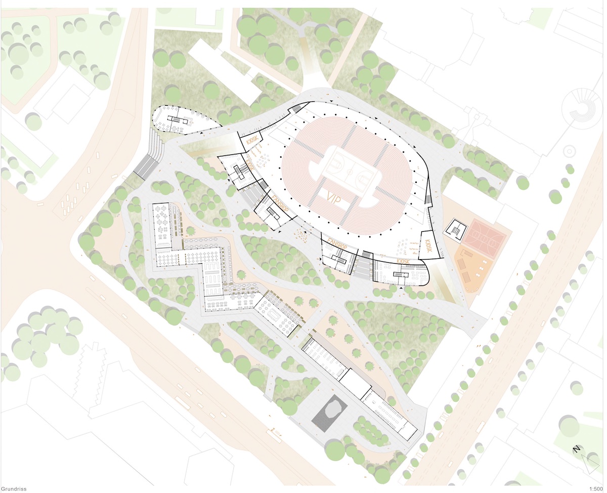 Die Arena ist in den Boden eingelassen und dadurch barrierefrei und auf jeder Seite auf der Höhe der Geländeoberkante zu betreten. Durch die daraus entstehende geringe Höhe der Arena ist es möglich über Rampen mit maximal 6% Steigung in den auf dem Dach gelegenen Park zu gelangen. Damit die Rampen keinen verschwendeten Platz darstellen liegen darunter Nutzungen für die Arena wie Verkauf, Kiosk oder Fanshops und im Außenbereich Fahrradständer.