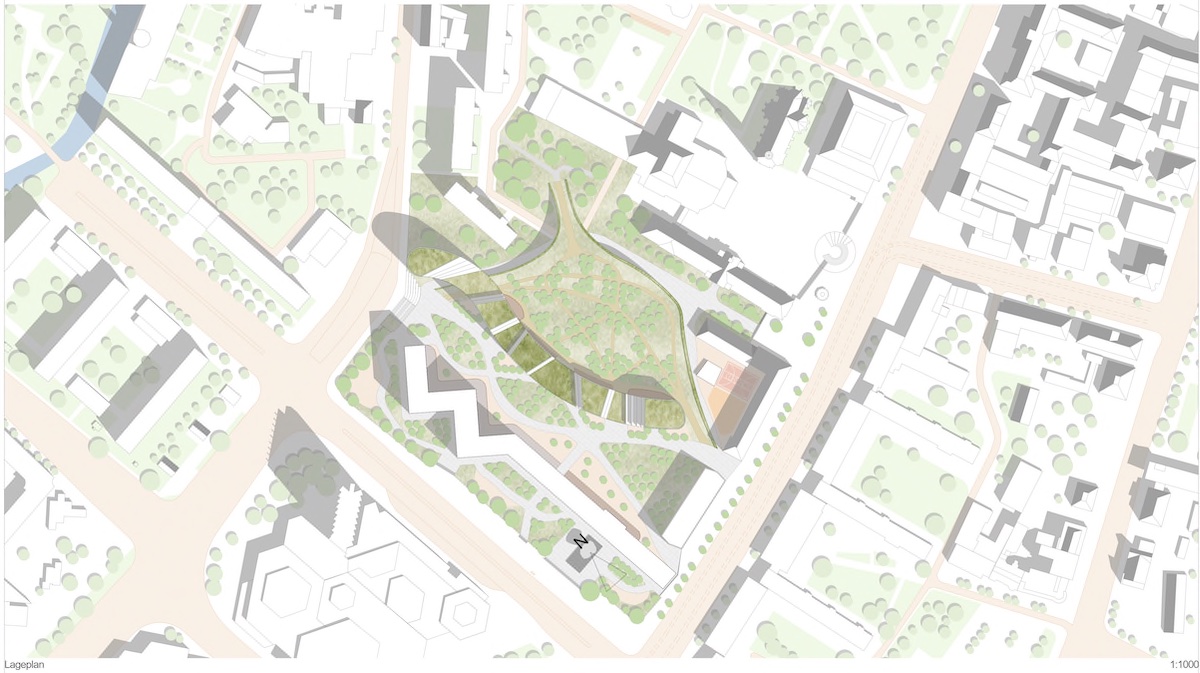 Der neue Gegenspieler der Parteisäge soll einen modernen Kontrast zu ihr bieten. Mit seiner organischen geschwungenen Silhouette ist er maßgebend für die Dynamik des Entwurfs, welche sich in der Wegeführung über das ganze Gelände widerspiegelt. Das überhöhte Erdgeschoss ist so gewählt, dass es im 1. Obergeschoss einen direkten Austritt in den Park gibt. Die Materialien der Fassade aus Holz, Beton und Putz bilden ein harmonisch Gesamtbild. Die Holzschiebeläden, die als Sonnenschutz dienen, sind ein durchgängiges Element, die die Zusammengehörigkeit des Entwurfs zeigen.