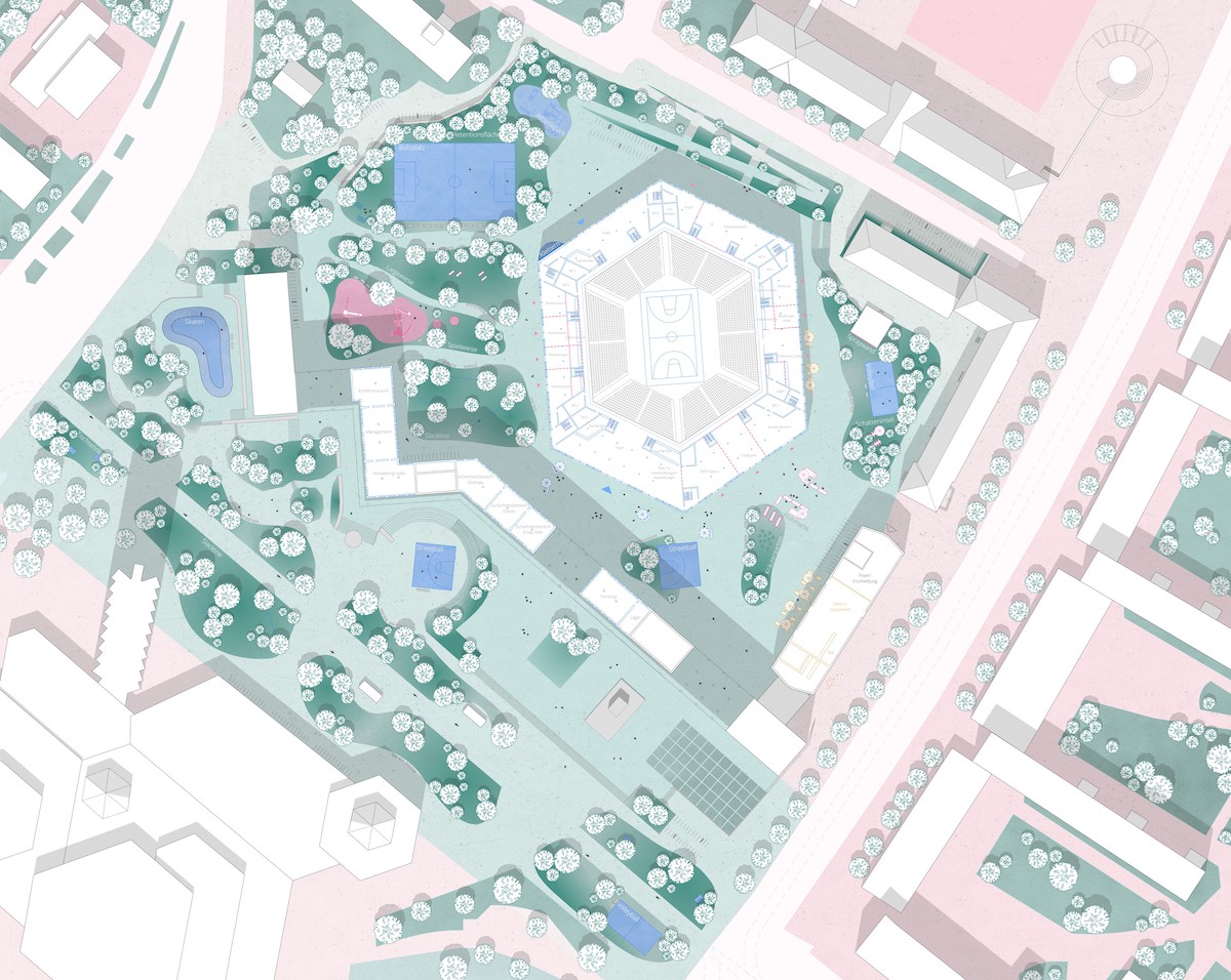 Die Halle wird zur Brückenstraße orientiert und teilt das Grundstück in zwei Bereiche: Im Osten entsteht ein Jugendbereich mit offenen Treffpunkten, pädagogischen Angeboten, Kreativräumen und einem inklusiven Café. Ein vorgelagerter Platz bietet Raum für Feste und Märkte. Im Westen liegt der Sportbereich mit Spiel- und Bewegungsflächen, ergänzt durch sportliche Nutzungen entlang der Brückenstraße.