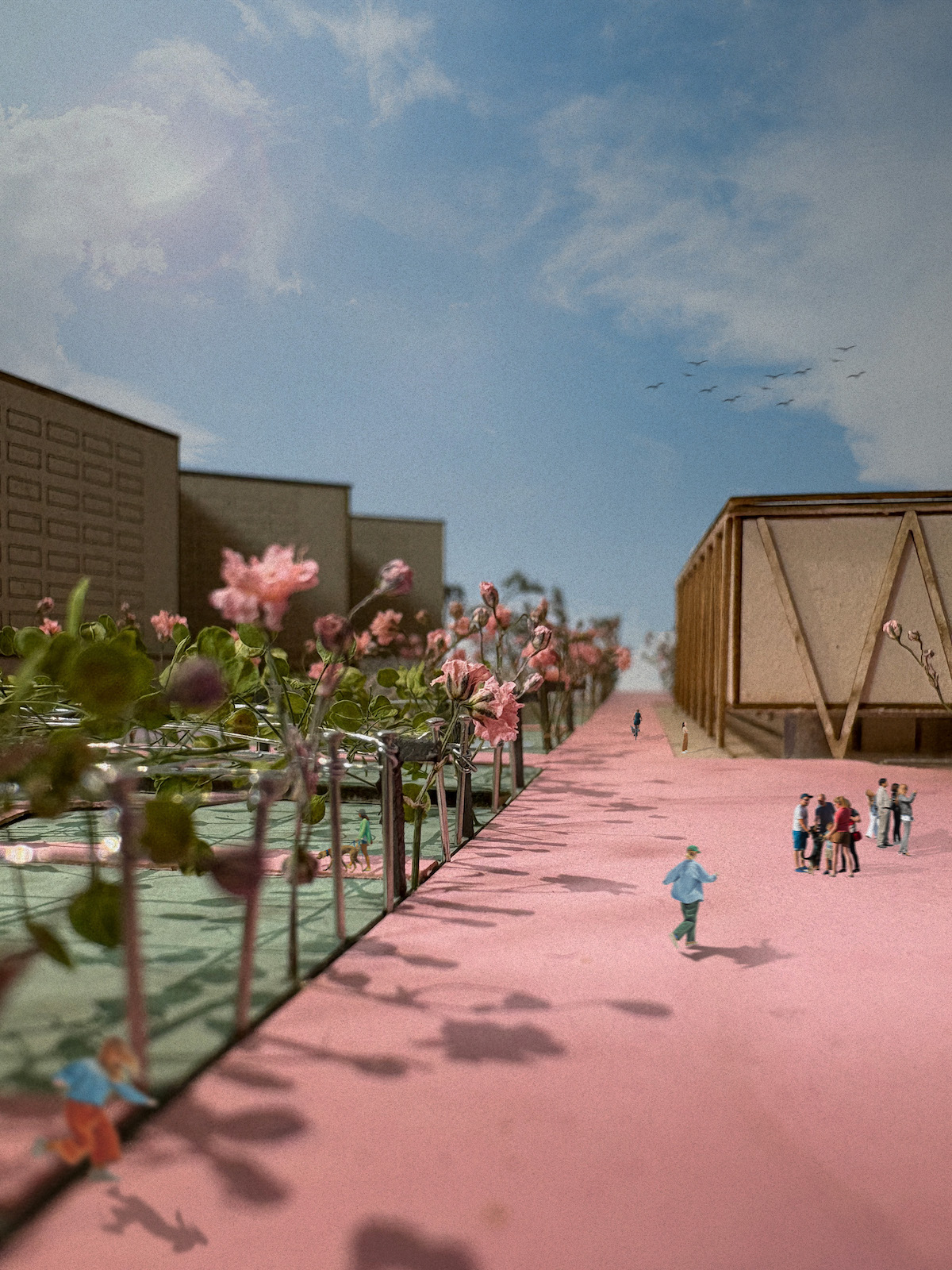 Der Scha\engarten soll als Ort der Ruhe und Entspannung dienen. Die bewachsene Drahtpergola bildet das Rückgrat des Gartens. Darunter wachsen scha\enverträgliche, teils essbare Pflanzen, die den Besucher: innen ein natürliches, geschütztes Umfeld bieten. Ergänzt wird der Garten durch einen flachen Wasserspiegel, der als ruhiges Gestaltungselement fungiert. Er reflekCert Licht und Bewegung, kühlt die Umgebung und macht den Garten zu einer städCschen Oase, die Aufenthaltsqualität und Mikroklima gleichermaßen stärkt.
