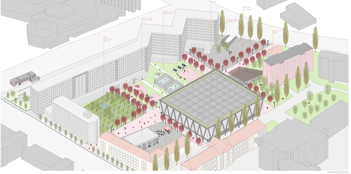 Der gesamte Platz ist von einer Rahmung aus Pappeln eingefasst, was eine starke räumliche Kontur schaY. Entlang der historischen Wegachsen sorgen rosa blühende Kirschbäume für saisonale Akzente und betonen die lineare Struktur des Ortes. Das bestehende Café wurde nicht nur erhalten, sondern durch zusätzliche Baumpflanzungen aufgewertet. Der grüne Charakter des Platzes wird dadurch gestärkt, ohne die Nutzbarkeit einzuschränken. Zudem wird das Erdgeschoss des bestehenden Gebäudes „Parteisäge“ akCviert: Es entstehen öffentlich zugängliche, kleinteilige Räume mit niedrigen Mieten für subkulturelle Nutzungen und urbane Alltagsangebote. Damit wird das Gebäude funkConal neu aufgeladen und dauerhaW belebt. Zwei gezielte Durchbrüche entlang der historischen Wegachsen öffnen das Gebäude zusätzlich und sie schaffen neue Querbeziehungen und ermöglichen weitere Zugänge zum Gelände, insbesondere auch für Fans bei Veranstaltungen. Zur besseren Erschließung und Vermeidung von Staus und Flaschenhals-SituaConen befinden sich an den Haupteingängen zwei großzügige Vorplätze, die als Verteilerzonen fungieren und auch kleinere Versammlungen oder Aufenthalte ermöglichen.