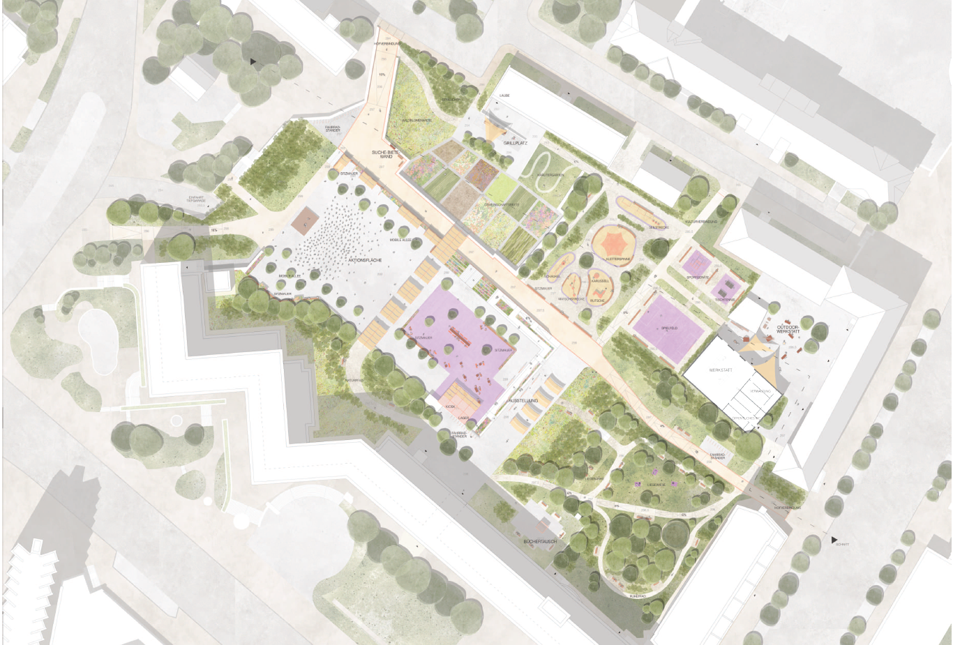 me ebenso wie offene Zonen mit Sichtbeziehungen und Bewegungsfreiheit. Die räumliche Organisation fördert dabei eine Vielfalt von Nutzungen – Rückzug und Spiel, Arbeit und Pause, gemeinschaftliche wie individuelle Aktivitäten. Gleichzeitig entsteht durch das Leitelement eine grafische Präsenz im Raum, die eine subtile Len- kung und Orientierung ermöglicht. Die Gestaltung bleibt bewusst leicht: keine massi- ven Einbauten, sondern mobile, flexible Strukturen, ergänzt durch Vegetation und punktuelle Ausstattung. Das Entwurfsareal versteht sich als offenes Gefüge aus Teil- höfen mit eigenem Charakter. Die bestehende Topografie und das Bestandsgebäude auf dem Gelände werden dabei in die Gestaltung integriert – Höhenunterschiede und bauliche Kanten helfen, unterschiedliche Nutzungsbereiche auszubilden.