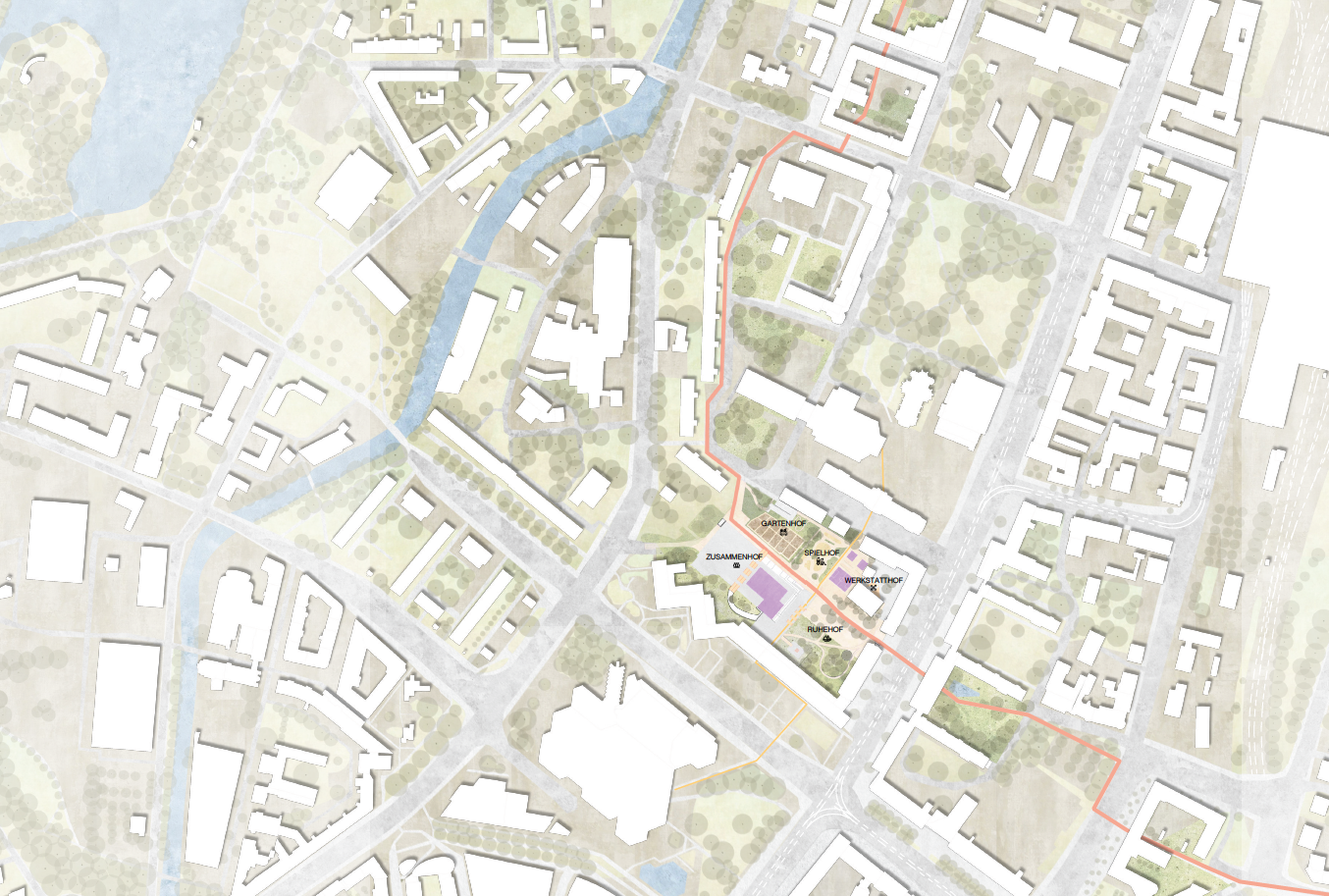 Im Verlauf unserer Auseinandersetzung mit dem Ort wurde deutlich, dass das Pla- nungsgebiet hinter der Parteifalte zwar nicht im klassischen Sinne als Hinterhof zu bezeichnen ist, aber dennoch gewisse Qualitäten solcher Räume andeutet. Die Diffe- renz zwischen dem lauten Straßenraum und der ruhigen Rückseite macht das Areal besonders und bietet die Grundlage für eine Neuinterpretation des Hofgedankens im städtischen Kontext von Chemnitz. In diesem ist der Hof Teil einer größeren Struktur. Nordwestlich schließt eine offene Hofstruktur an, die durch Zeilenbauten gegliedert wird und in den Brühl übergeht. Der Brühl wie auch der östlich anschließende Son- nenberg und der westlich gelegene Kaßberg sind durch gründerzeitliche Blockrand- bebauung mit klar gefassten Innenhöfen geprägt. Das Entwurfsareal liegt dabei zwi- schen dem Schillerplatz im Norden und dem Stadthallenpark im Süden – zwei öffent- lichen Grünanlagen, zwischen denen es als vermittelnder Zwischenraum wirkt. Gleichzeitig wird der Hof durch ein informelles Wegenetz mit den umliegenden Quar- tieren verbunden. Vom Stadtzentrum über die Parteifalte bis hin zu den Höfen des Brühls spannt sich eine alternative Route zur Mühlenstraße auf. Dieses Hofband er- möglicht nicht nur Durchwegung, sondern auch die Verbindung städtischer Institutio- nen – von der Stadthalle über das Opernhaus bis zur Kunstsammlung. Innerhalb die- ser Netzwerke entfaltet das Entwurfsareal seine spezifische Qualität: als Raum des Dazwischen, der weder Platz noch Park ist, sondern ein Möglichkeitsraum.