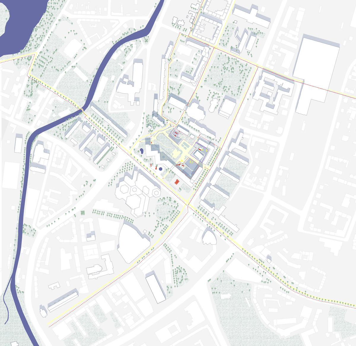 Die bestehende Kreativachse, welche zurzeit die Stadtteile Brühl, Sonnenberg und die Straße der Nationen durch kreative Institutionen miteinander verbindet, wird durch den Entwurf ergänzt. Eine neue Verbindung südlich zur Innenstadt und nach Westen in den Stadtteil Kaßberg wird geschaffen. Der Entwurfsort liegt im Zentrum dieser gesamten Kreativachse und bindet weitere Institutionen in die gesamte Achse ein, die sich an den im Areal eingegliederten Nutzungen orientieren.