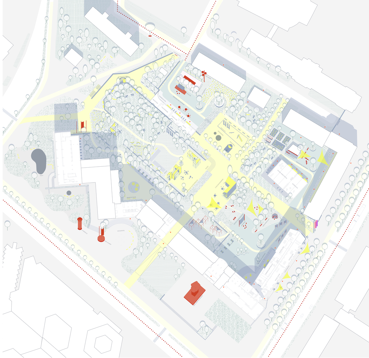 Zwischen den vier Teilbereichen entfaltet sich ein zentraler Kern, der als Übergangsbereich zwischen öffentlichen und privaten Nutzungen fungiert. Er lädt zum freien Verweilen ein und verzichtet bewusst auf ein vordefiniertes narratives Programm.