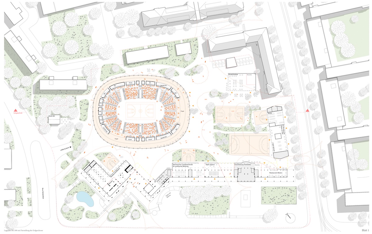 Die Position der Arena ergibt sich aus der (laut Rückfragen dann) abgerissenen Tiefgarage und der entstehenden Baugrube. Durch diese Verortung der Arena wird zusätzlich der Baumbestand größtenteils erhalten.